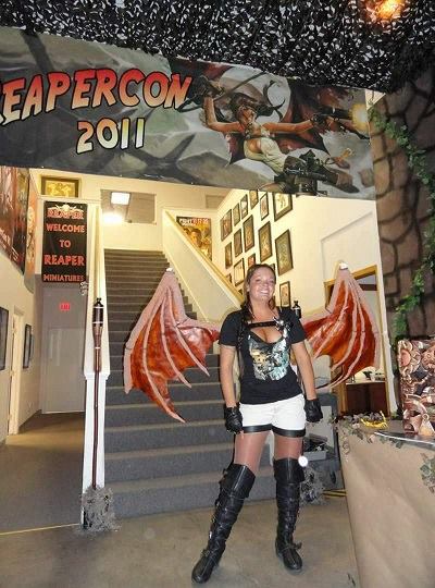 In the photos, she’s cosplaying as Sophie the Succubus, the Reaper Miniatures company mascot; Sophie can be seen in the banner at the top of the picture.